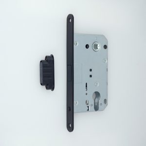 The lock set features precision engineering with smooth operation mechanisms. The aluminium handles are treated with advanced surface finishing techniques to prevent oxidation and maintain their aesthetic appeal. The steel base plate ensures secure mounting and distributes operational stress evenly across the door surface.